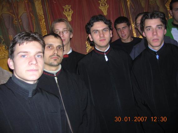 În anul 1995, un grup de elevi de la Seminarul Teologic „Sfântul Vasile cel Mare” din Iași s-a adunat în jurul părintelui Arhimandrit Clement Haralam, stareț pe atunci al mănăstirii Sf. Trei Ierarhi din Iași, punând bazele corului „Theodor V. Stupcanu”. Lor li s-au alăturat, treptat, și alți colegi, împreună punând în practică la slujbe și sărbători cunoștințele dobândite de la părintele profesor Florin Bucescu, cel care i-a inițiat în tainele muzicii psaltice și care i-a învățat buna glăsuire a tradiției românești a muzicii psaltice.